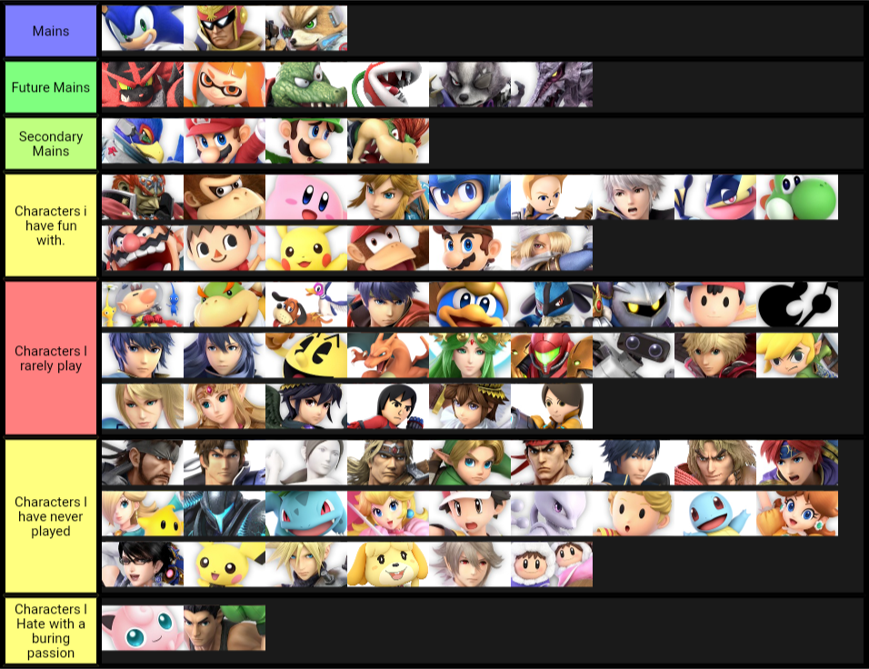 Smash 4 character tier list. Smash 4 character honesty tier list. Super smash bros wii u tiers. This is just one of many pokémon characters appearing on the list and smash bros first dlc character. Both characters have thus far ranked poorly in smash 4s tier lists with mii brawler notably ranking 56th out of a pool of 58 characters in the games third tier list. A lower number shows that more people agree with this characters match ups while a higher number shows that this characters match ups are more contentious. Ssb4 this is the latest and most widely accepted smash tier list for super smash bros.